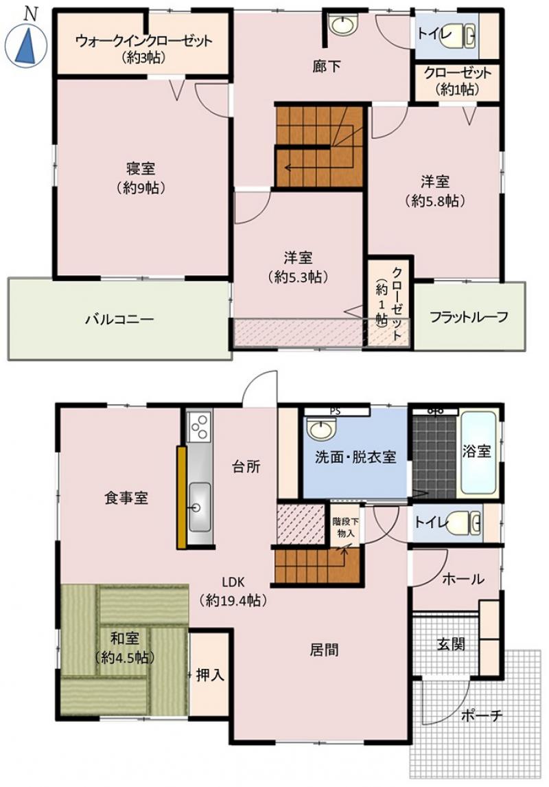 建物面積 | 1F 58.92㎡ 2F 55.61㎡ 延床 114.53㎡(34.64坪) |