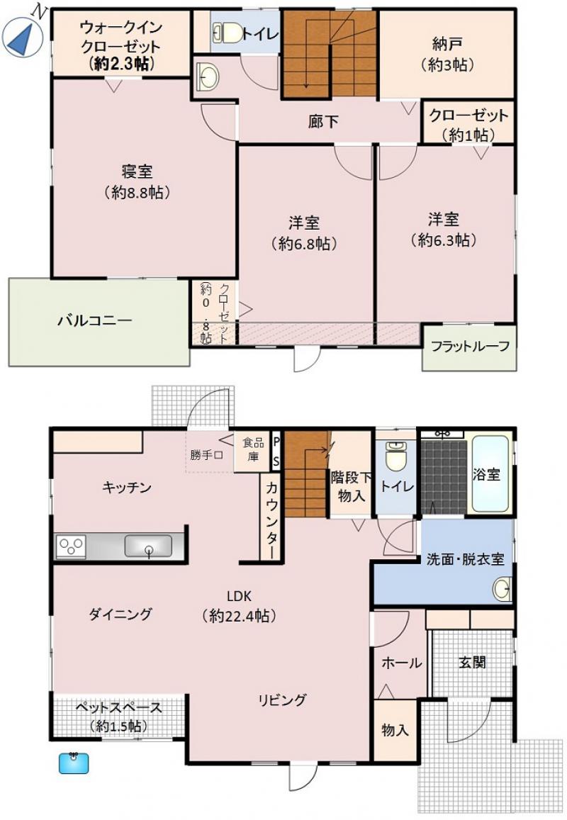 建物面積 | 1F 59.34㎡ 2F 58.51㎡ 延床 117.85㎡(35.64坪) |