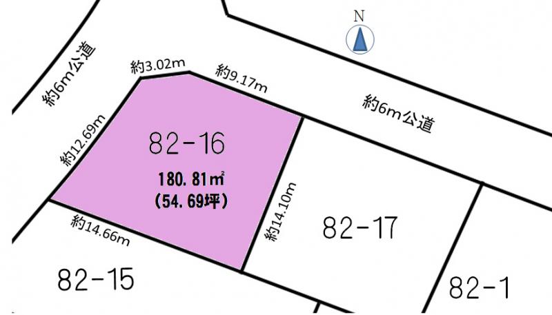 接道(幅員/方角/接面) | 約6m公道 / 北西・北東(角地) / 約24.88m |